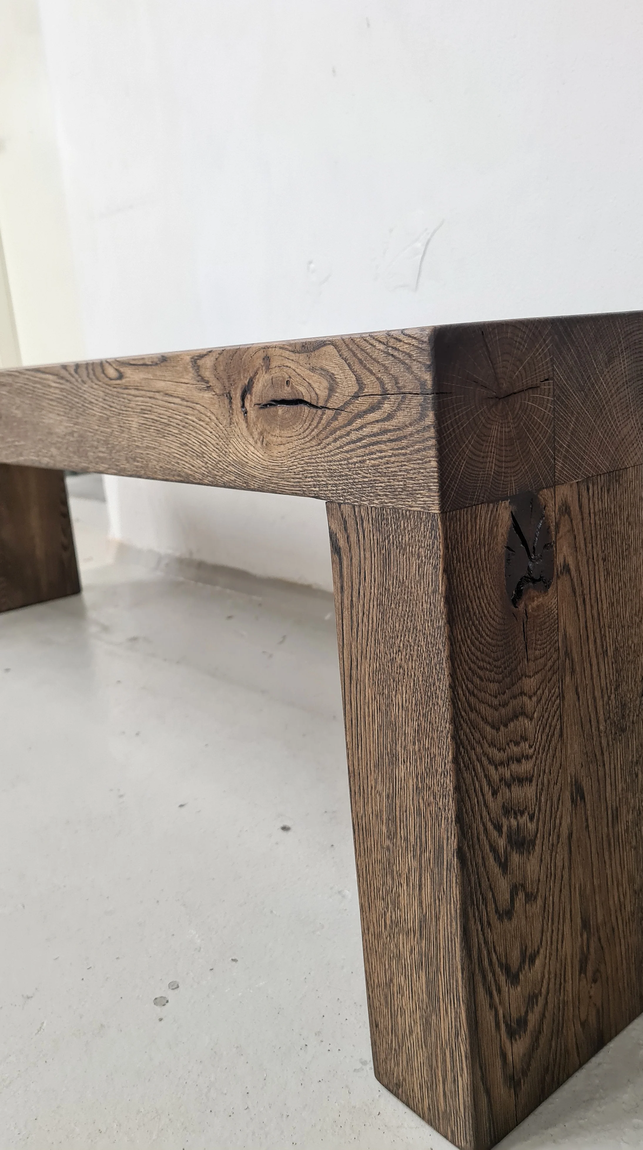 Kauniisti patinoituneista rustic tammipalkeista valmistettu penkki. Täynnä puun upeita yksityiskohtia, oksia ja halkeamia. Istuinosan oksakohdat/halkeamat täytetty mustalla epoksilla.