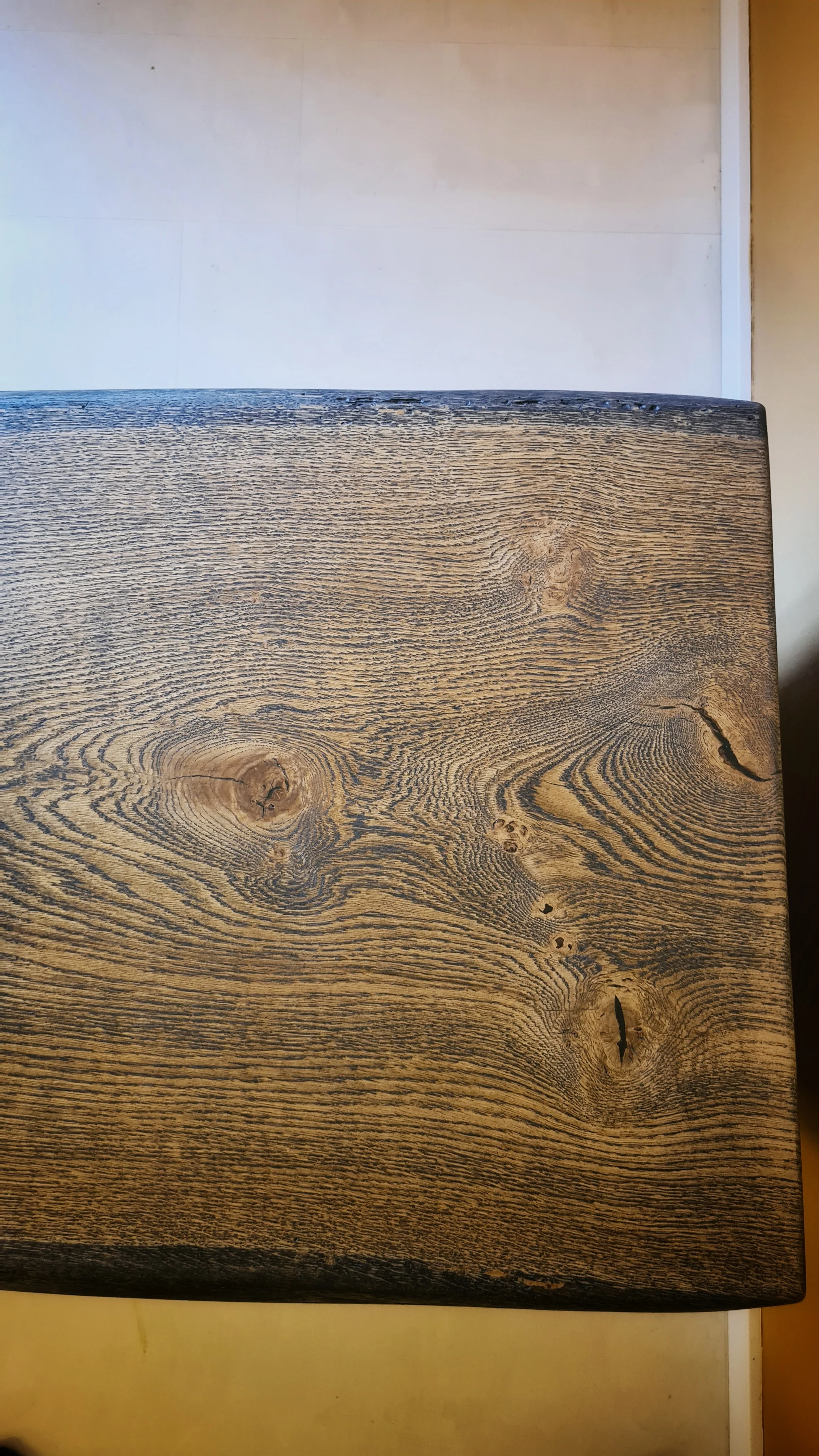 Tämä sohvapöytä tehdään yli 100 vuotta vanhasta, yhdestä kokonaisesta tammilankusta. Jalkojen ja tason väliin on tehty jiiriliitokset. Näin puun yksityiskohdat jatkuu saumattomasti jalkoihin asti. Pöydän reunat jätetään puun luonnolliseen muotoon.